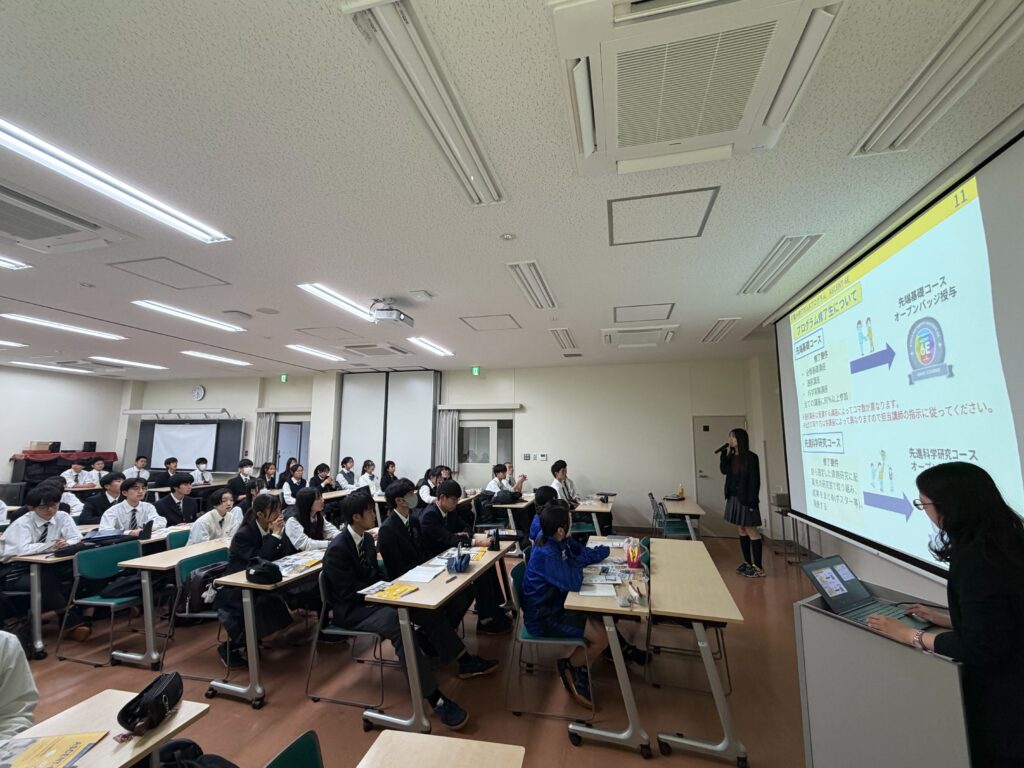 説明会には60名を超える生徒が参加し、会場は大変盛況となりました。生徒たちにとって、大学での高度な学びや研究活動に触れる貴重な機会となりました。