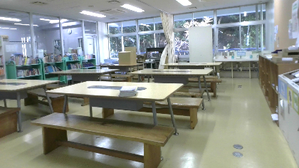 各学年の他クラスとの交流の場所となっており、休み時間はおしゃべりをするなど賑やかな空間となっています。また、放課後はパソコンを使用しながらの自習用スペースとなります。