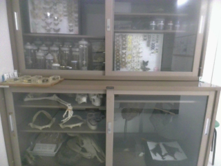 生物を飼っている水槽やケージがあります。また、下の写真のように入口付近に生物の標本もあります。